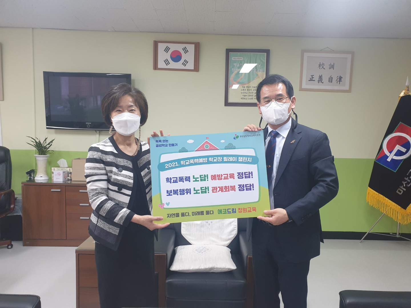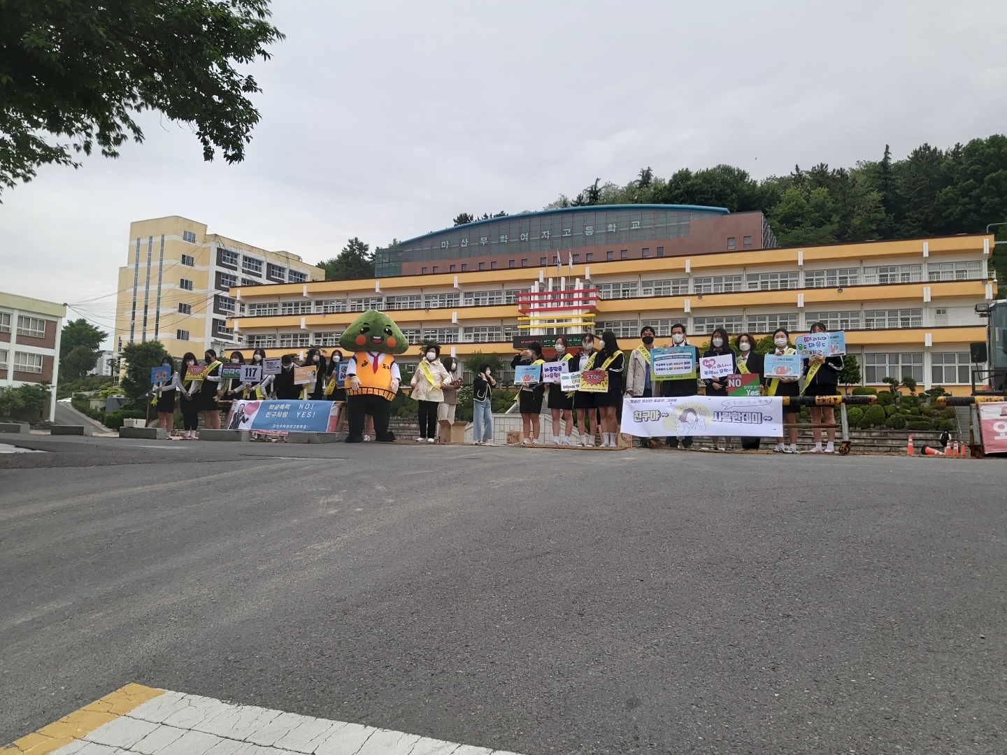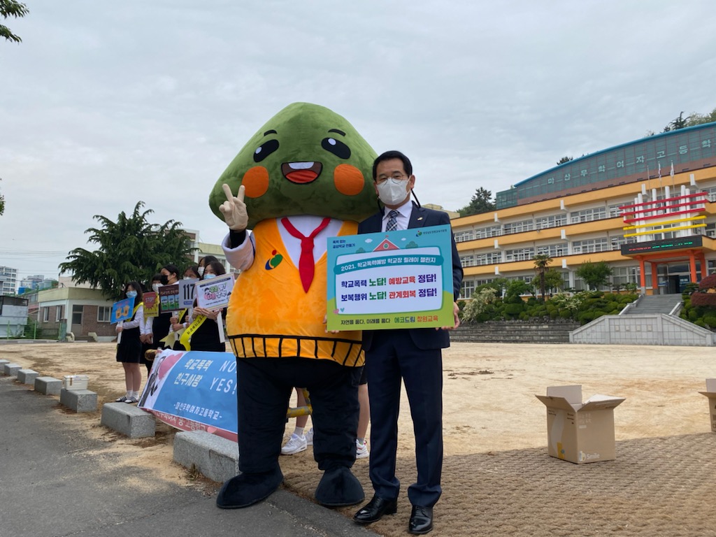 창원 관내 모든 학교가 함께 참여하는 학교폭력 예방활동 '학교폭력예방 학교장 릴레이 챌린지' 행사를 5/11(화) 학생아침맞이 시간에 실시한 뒤, 12일 차기 행사 학교인 구암고등학교에 피켓을 무사히 전달하였습니다. 이번 행사는 경남 학교폭력예방 캐릭터인 '도아'와 함께 진행하며 우리 학생들이 학교폭력에 대한 경각심을 가지고 주위 친구를 돌아볼 수 있는 경험이 되도록 노력하였습니다. 등교길에 교장 선생님께서 먼저 나서서 학생회 임원들과 함께 구호도 외쳐 주시고, 학생들에게 '정을 나누자'는 의미로 선생님들께서 초코파이도 나누어 주었습니다. 그 결과 즐거운 마음으로 모든 학생들이 참여한 뜻깊은 행사였습니다.