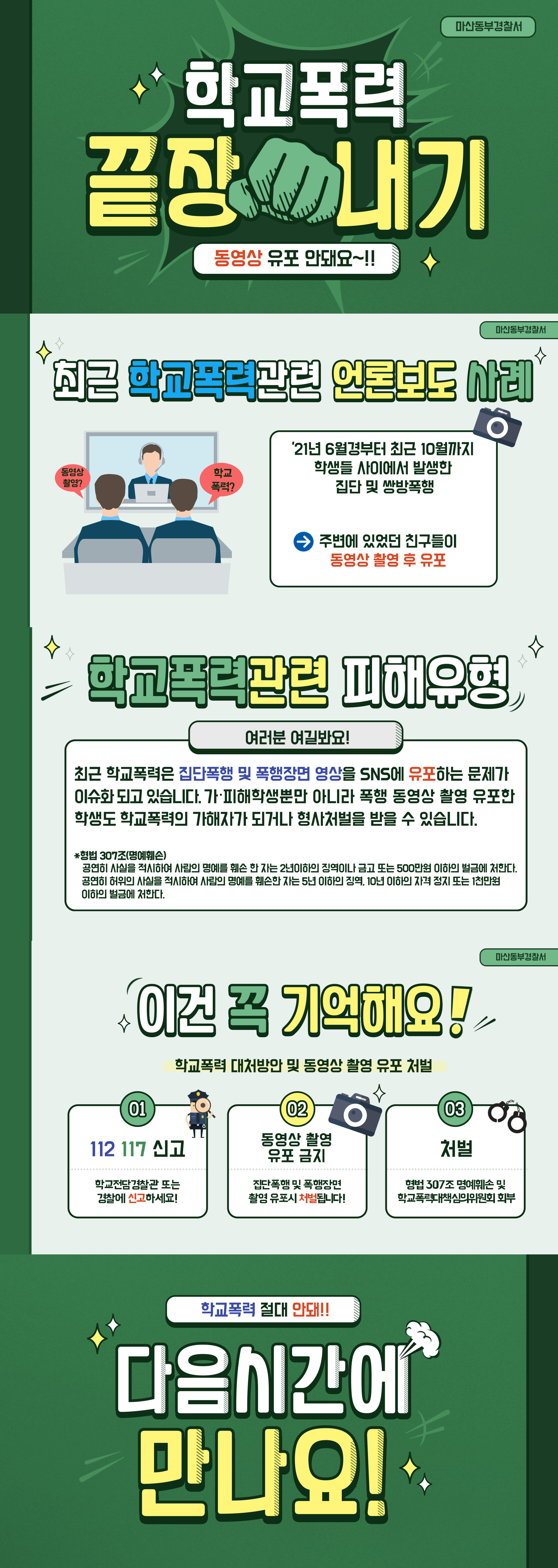 최근 학교폭력 사례 언론보도 등과 관련하여 집단폭행 및 폭행장면 영상을 SNS에 유포하는 문제가 이슈화 됨에 따라 홍보 자료(카드뉴스)를 탑재합니다.