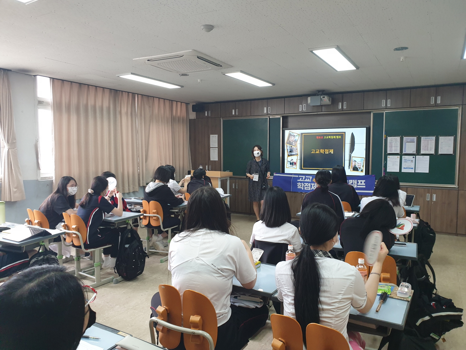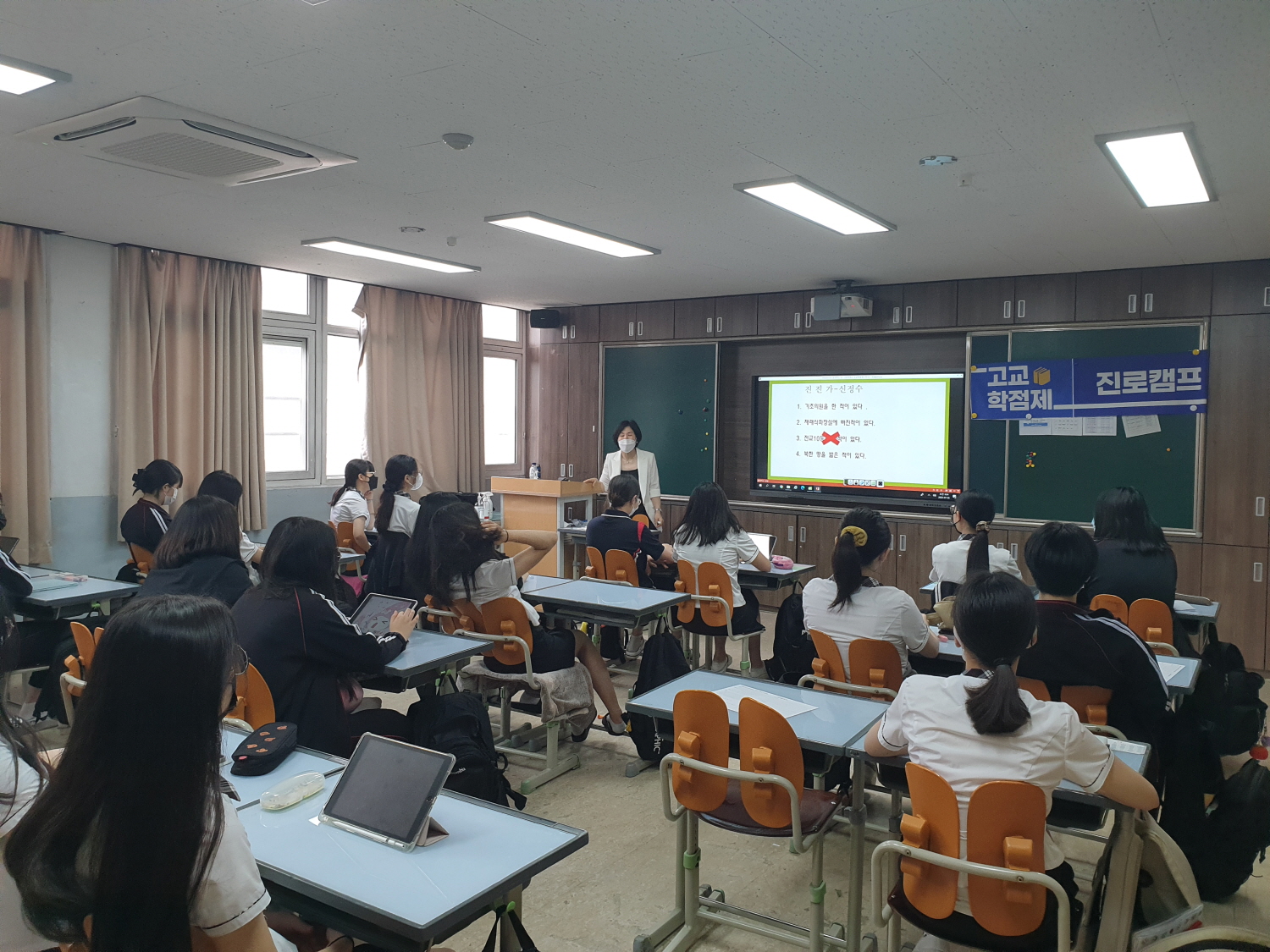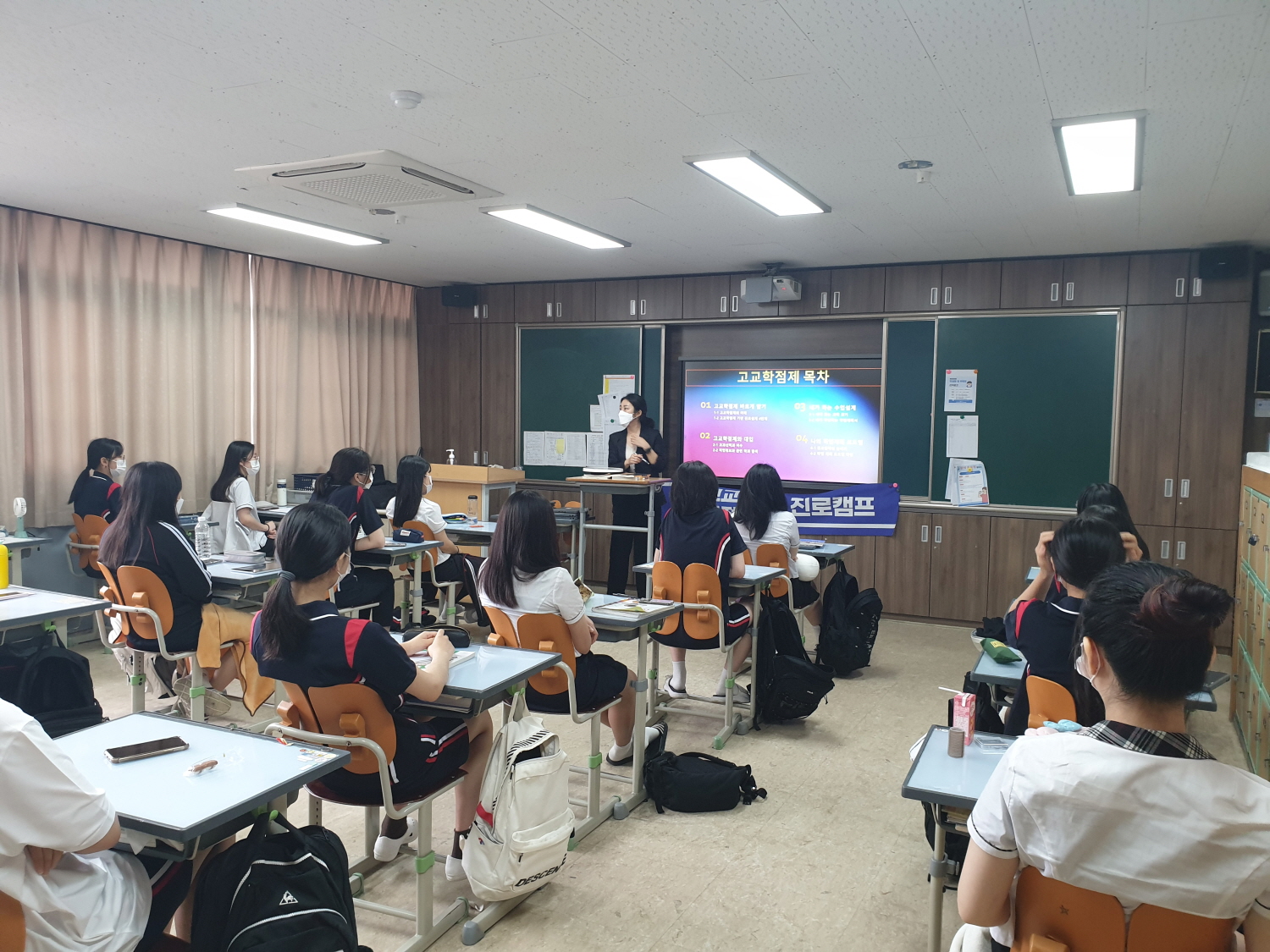 고교학점제 정착 및 진로와 적성에 맞는 과목 선택을 위하여 제 1회 고교학점제 캠프를 아래와 같이 운영하였습니다. 가. 일시: 2022. 07. 06.(수), 1교시 ~ 5교시 나: 장소: 각 반 교실(1교시 ~ 4교시), 시청각실(5교시) 다. 대상: 1학년 전체 라. 세부 일정 1교시~ 4교시 | | 5교시 | | 추후 일정 | 대학전공계열 학과 선택, 선택과목의 안내, 전공적합성과 대학입시, 학교 편제표와 수강신청 | → |