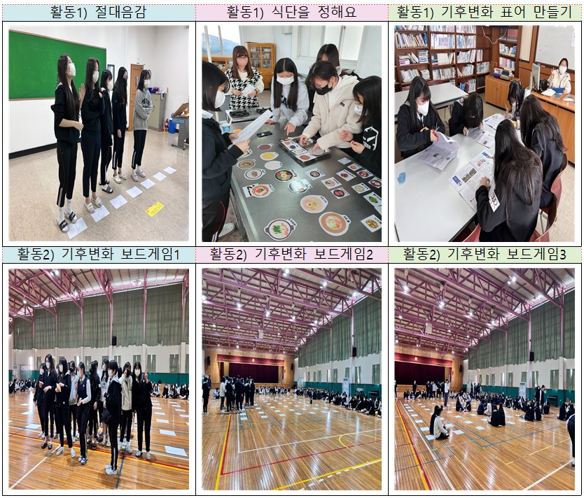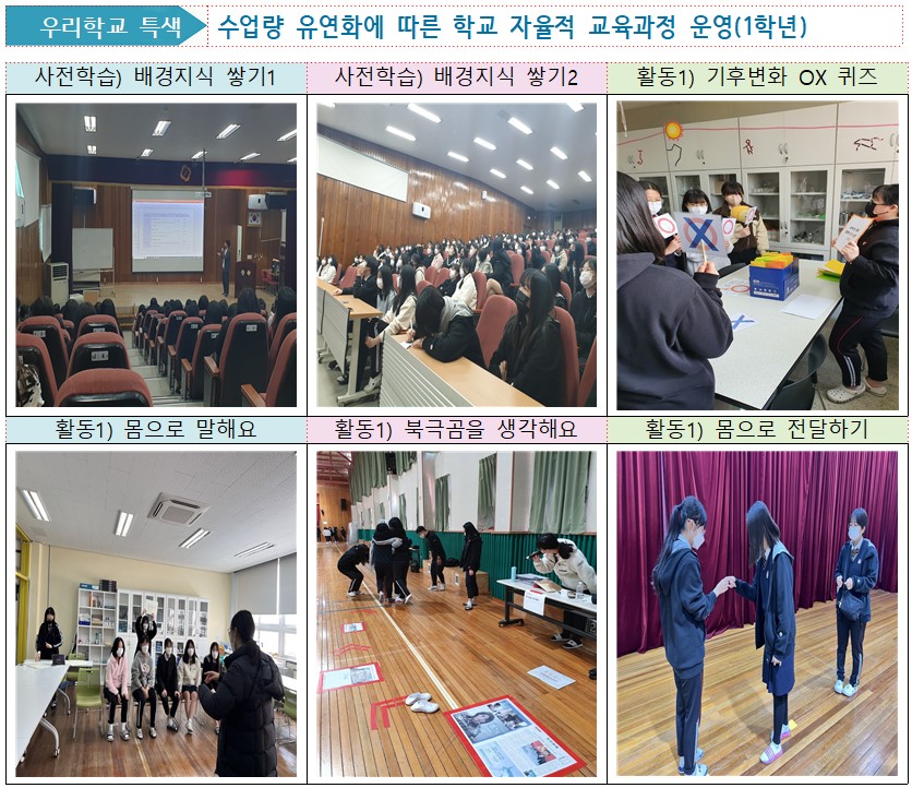 1학년 학생들에게 기후위기라는 주제로 자율적 교육과정을 운영하였습니다. 학생들에게 기후변화에 따른 기후위기에 대해 알려주고자 동영상과 학습지를 제공하였고 이를 통해 기본적인 지식을 함양하였습니다. 이후 활동1과 활동2로 이루어진 미션을 통해 체험 활동을 겸비한 프로젝트를 진행하였는데, 프로젝트 진행을 위해 각 반별 스텝 학생들을 미리 선정하고 미션을 진행하기 위해 자신의 역할을 책임감 있게 준비하는 등의 모습을 보였습니다. 활동1은 학생들이 오감을 활용하여 체험이 가능한 활동 중심형 프로그램으로 기후변화 퀴즈, 몸으로 말해요, 북극곰을 생각해요, 절대음감, 기후변화 표어 만들기 등의 다양한 미션 활동으로 구성되어 있습니다. 활동2는 기후변화에 대한 지식을 바탕으로 통합사회, 통합과학 시간에 배운 교육과정 내용을 활용하여 사실과 픽션의 내용을 담은 보드게임 형태의 프로그램입니다. 학생들이 이 활동을 계획하고 준비함으로써 자신의 역량을 적극적으로 발휘하였고, 교사들은 창의 융합형 인재 양성에 맞춘 핵심역량을 학생들이 함양하도록 프로그램 내용을 체계적으로 기획하는 계기가 되었습니다.