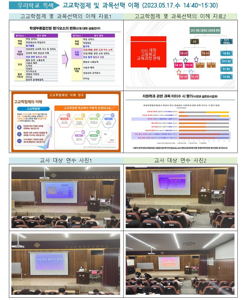 고교학점제 안착을 위한 우리학교 역량 제고 지원을 통해 학생 개인의 진로와 적성에 따른 맞춤형 교육과정을 제공하고자 전체 교직원을 대상으로 고교학점제 및 과목선택의 이해라는 주제로 연수를 진행하였습니다.