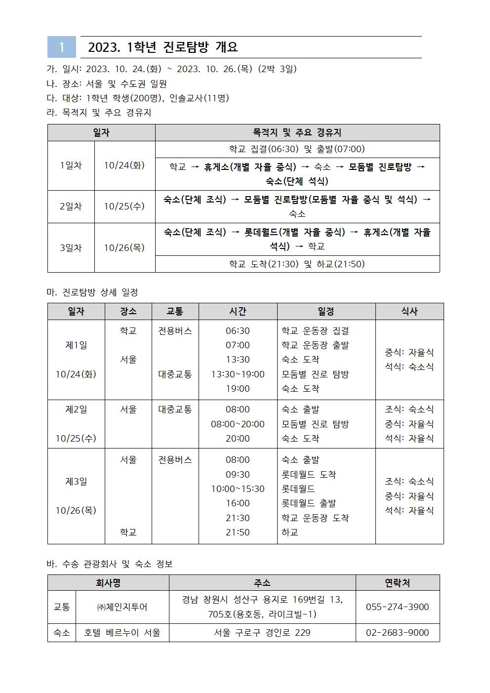 2023. 1학년 진로탐방 일정