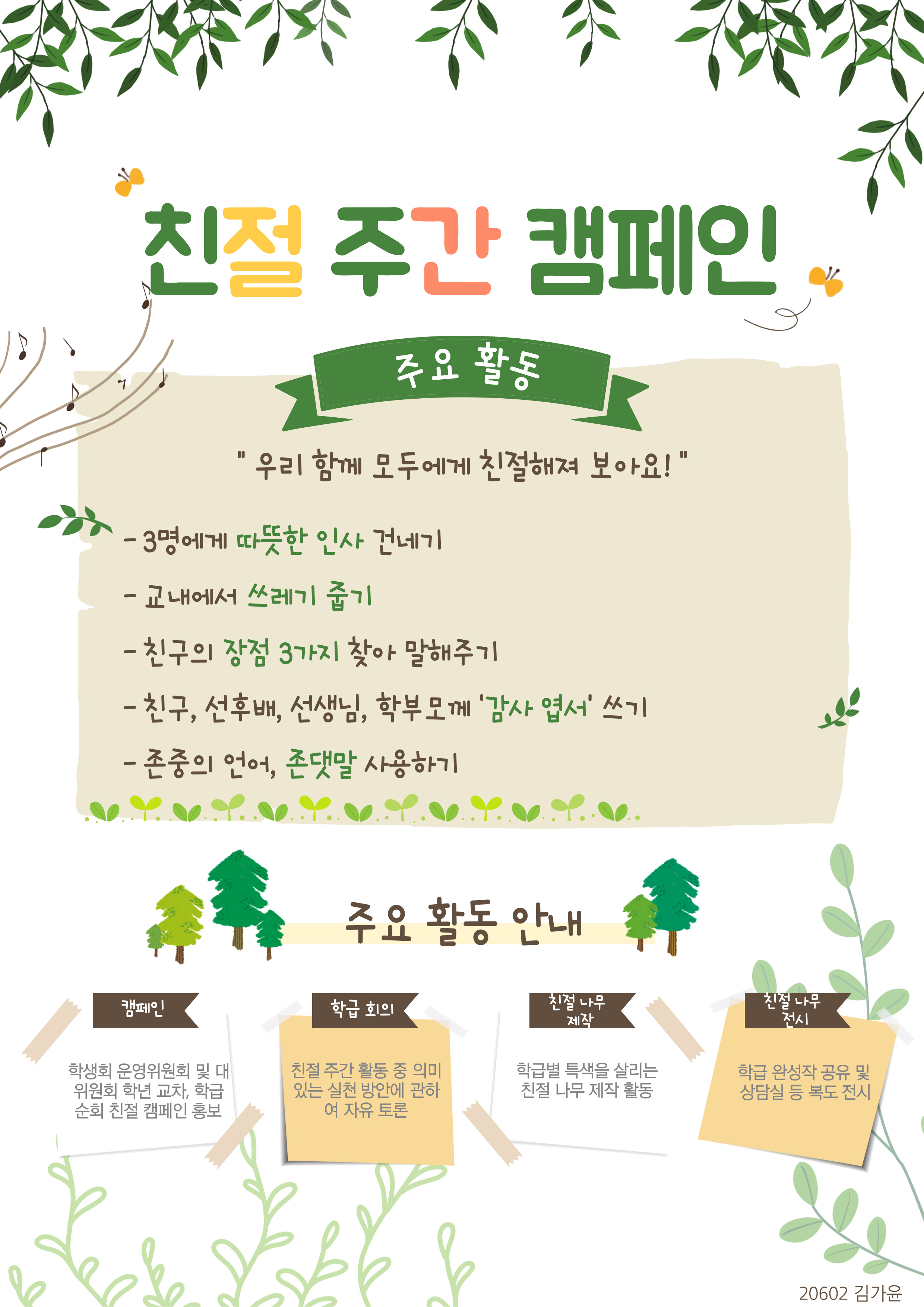 교내 친절 주간 캠페인과 관련한 플랜카드 및 포스터 안내입니다.