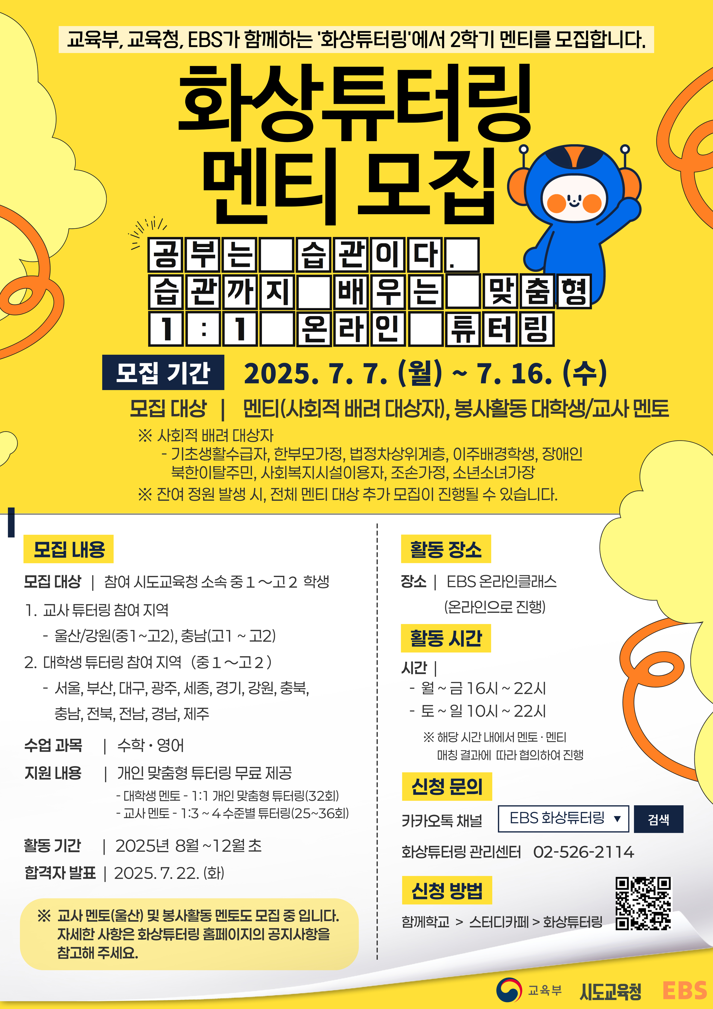 2025년 EBS화상튜터링 사업 2학기 멘티학생 모집 안내