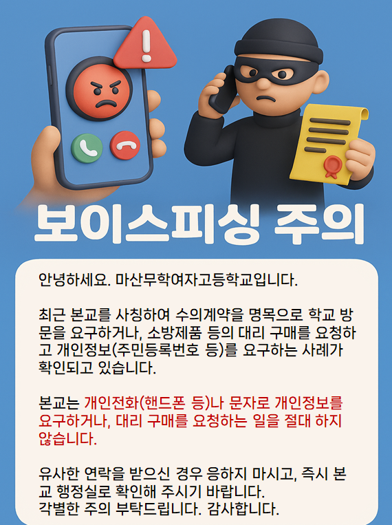 안녕하세요. 마산무학여자고등학교입니다.최근 본교를 사칭하여 수의계약을 명목으로 학교 방문을 요구하거나, 소방제품 등의 대리 구매를 요청하고 개인정보(주민등록번호 등)를 요구하는 사례가 확인되고 있습니다.본교는 개인전화(핸드폰 등)나 문자로 개인정보를 요구하거나, 대리 구매를 요청하는 일을 절대 하지 않습니다.